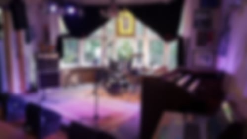 Voll ausgestattete Innenbühne: Drum Kit, Guitar and Bass Amp, Hammond A 100, Ibach Flügel, DB Technologies Audio PA and Monitor, Presonus R32 Mixer - get in and play!